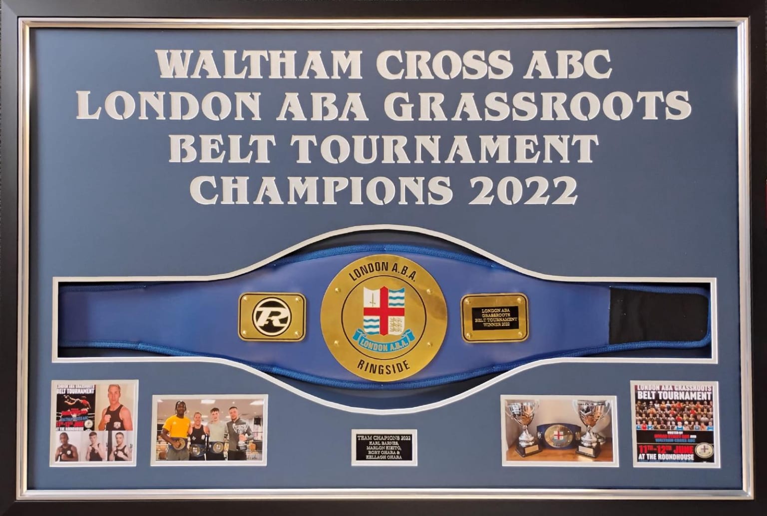 This stunning belt was expertly framed by us for Waltham Cross Amateur Boxing Club. The frame is impressive, measuring over 220cm length and 90cm in width. Its sleek black and gold design perfectly complements the belt, with matching blue and gold wording that adds a touch of elegance and class.