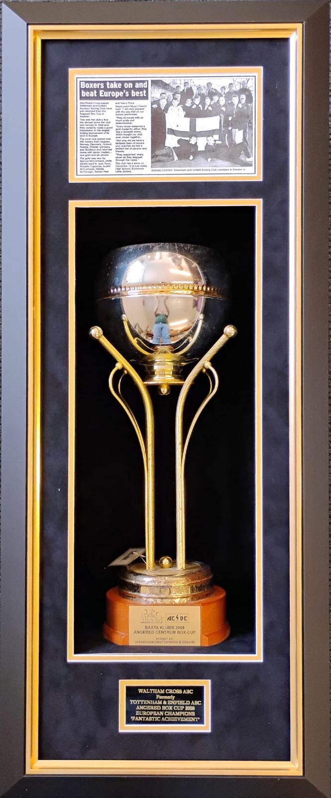 his stunning cup was won by Waltham Cross Amateur Boxing Club in Sweden 2008 after being awarded Club of Europe. Now, beautifully showcased in its striking black and gold frame, it proudly hangs on the wall, making for an incredible display piece and a fantastic addition to any club.