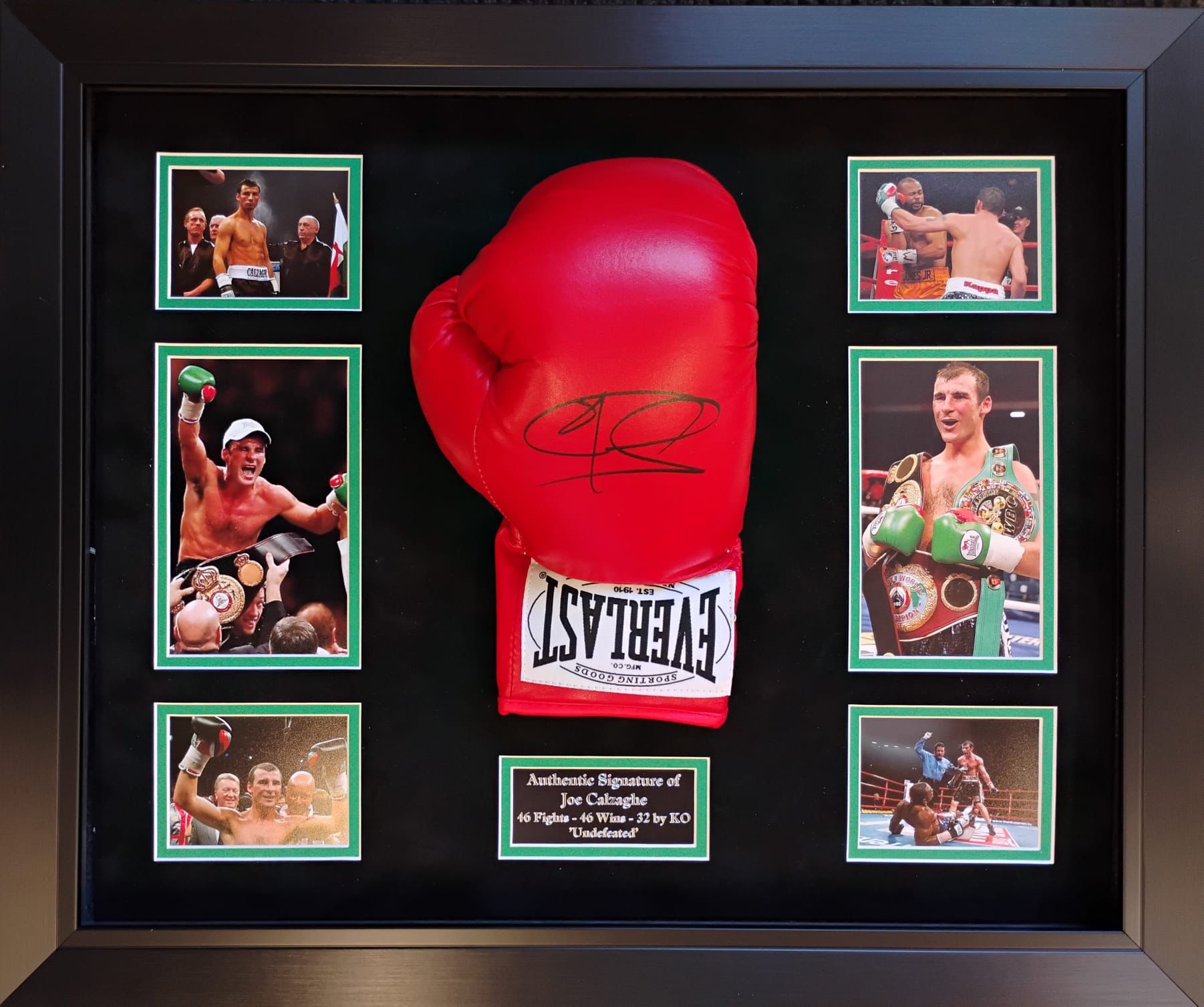 Celebrate the legendary career of Joe Calzaghe, one of the greatest undefeated champions in boxing history, with this authentic hand-signed boxing glove. A premium collector’s item from the iconic Welsh warrior, this glove is the perfect centrepiece for any serious boxing collection.